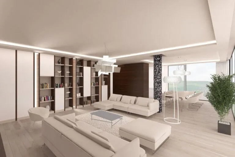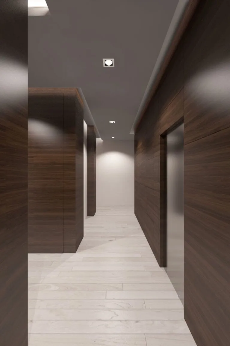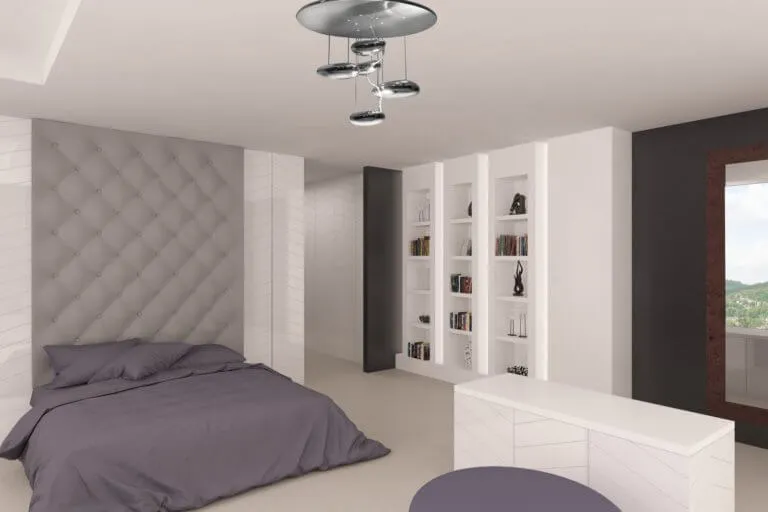 A fehér enteriőr magától értetődő eleganciáját üveggyöngyök, nemes, sötét fa és finom tapintású anyagok keretezik.