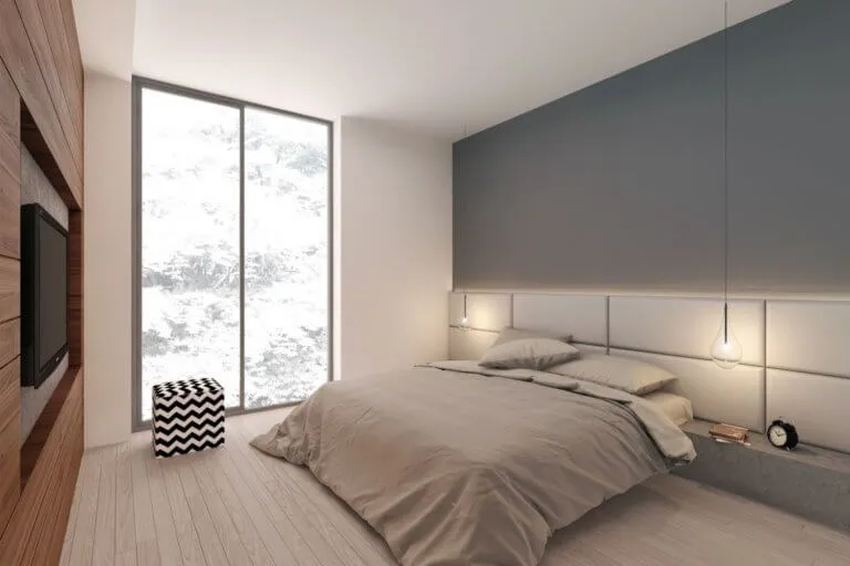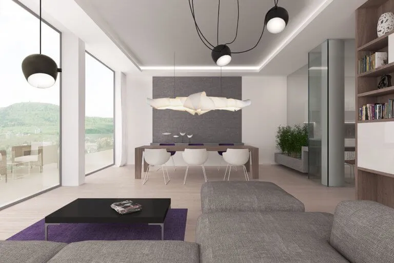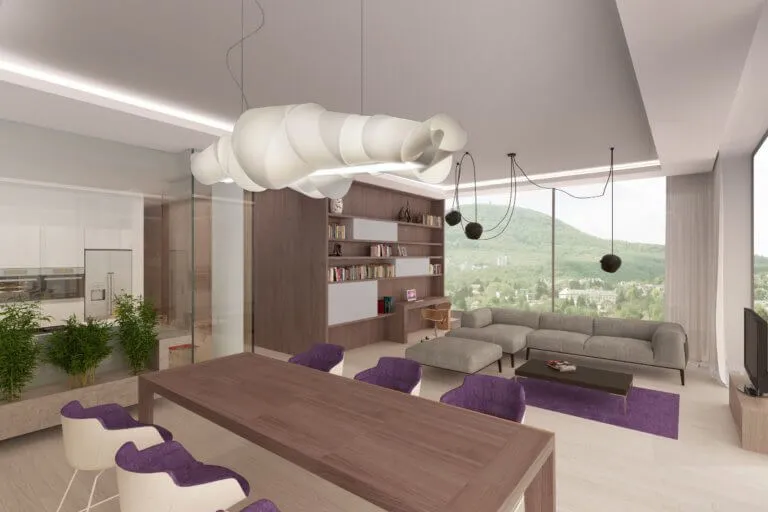 A szándékosan alacsony bútorok, a konyha üvegfala, de még az étkező felhőt idéző lámpája is a panoráma kiemelését szolgálják.