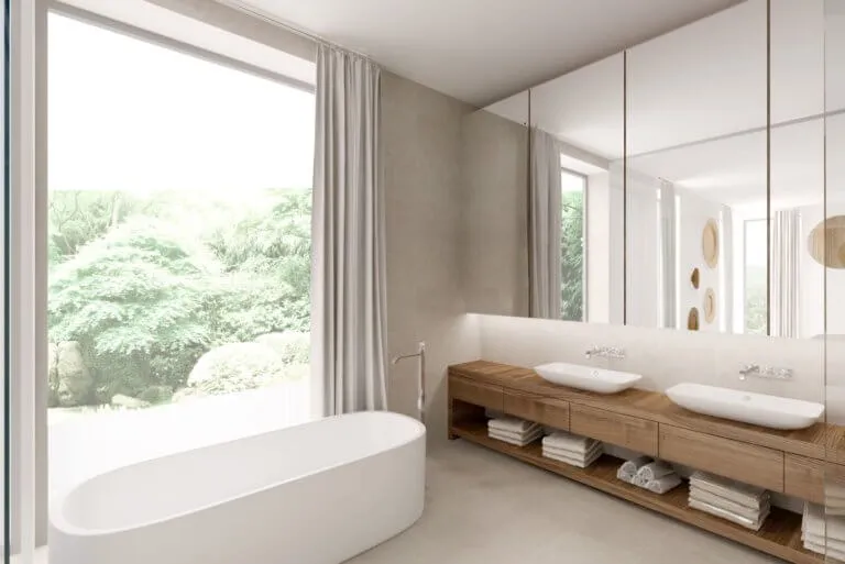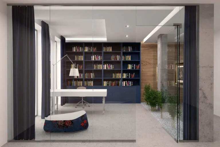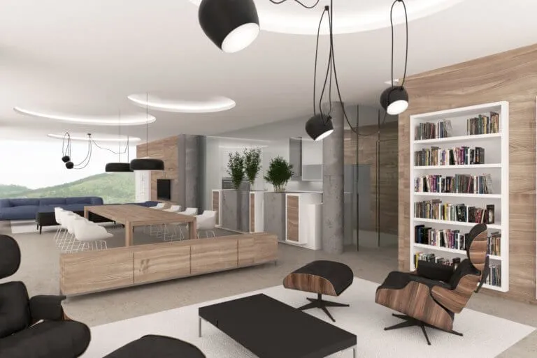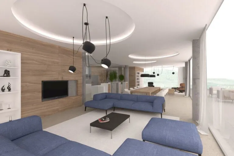 Semleges padló, könnyed kék színek és egyszerű lámpák felelnek a mindenhol felbukkanó faerezet díszítőmotívummá emeléséért.