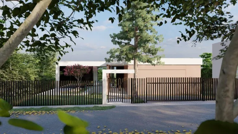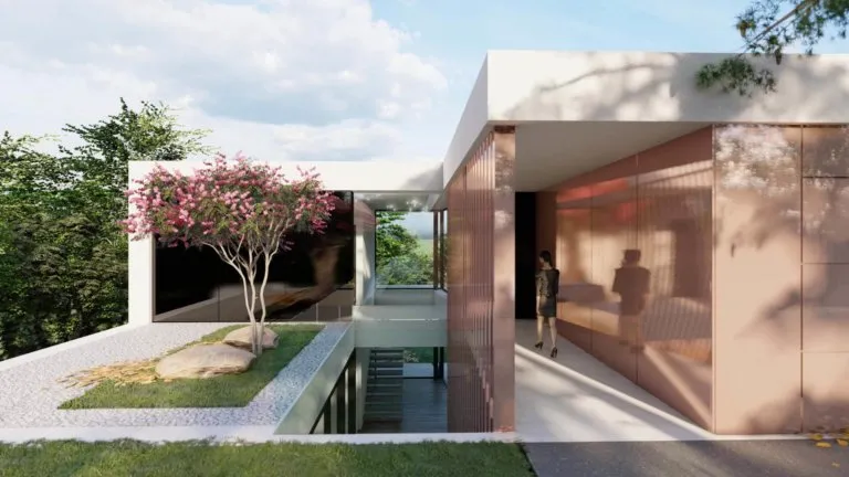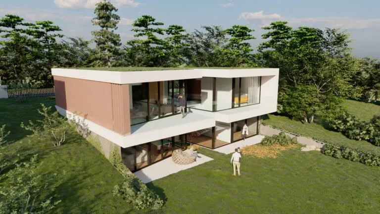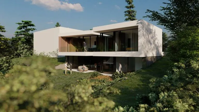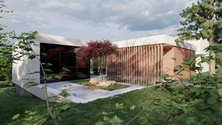 The family house, constructed of block-like cubes opening towards the garden, is divided into functional units by a narrow courtyard of light.