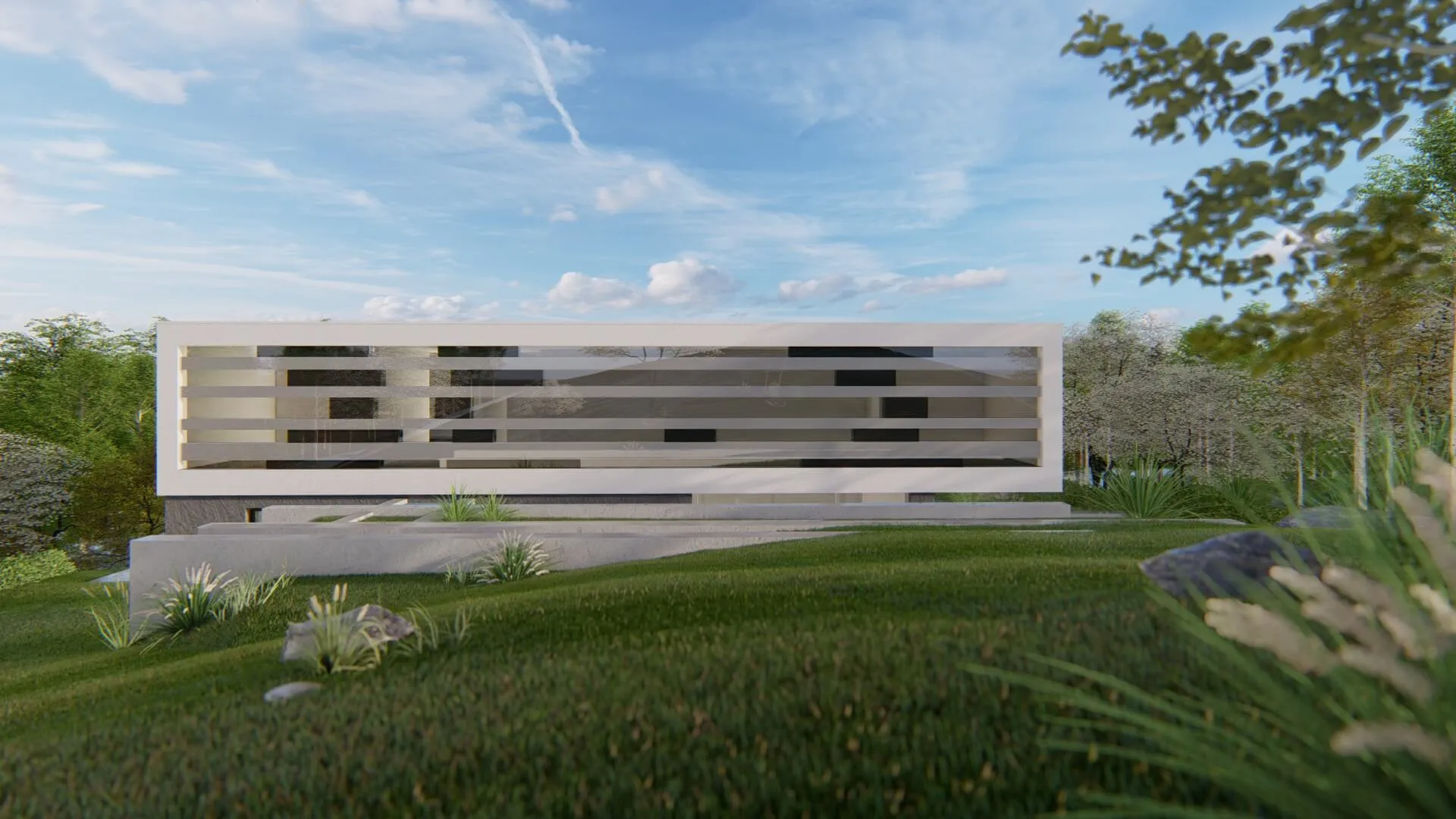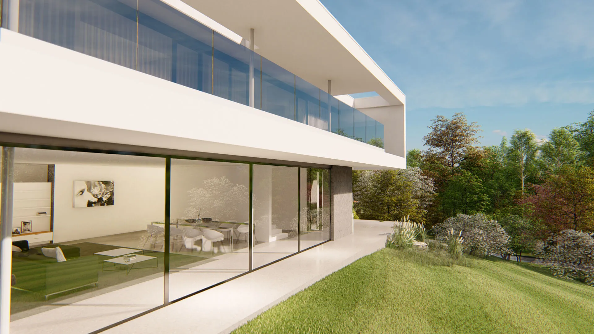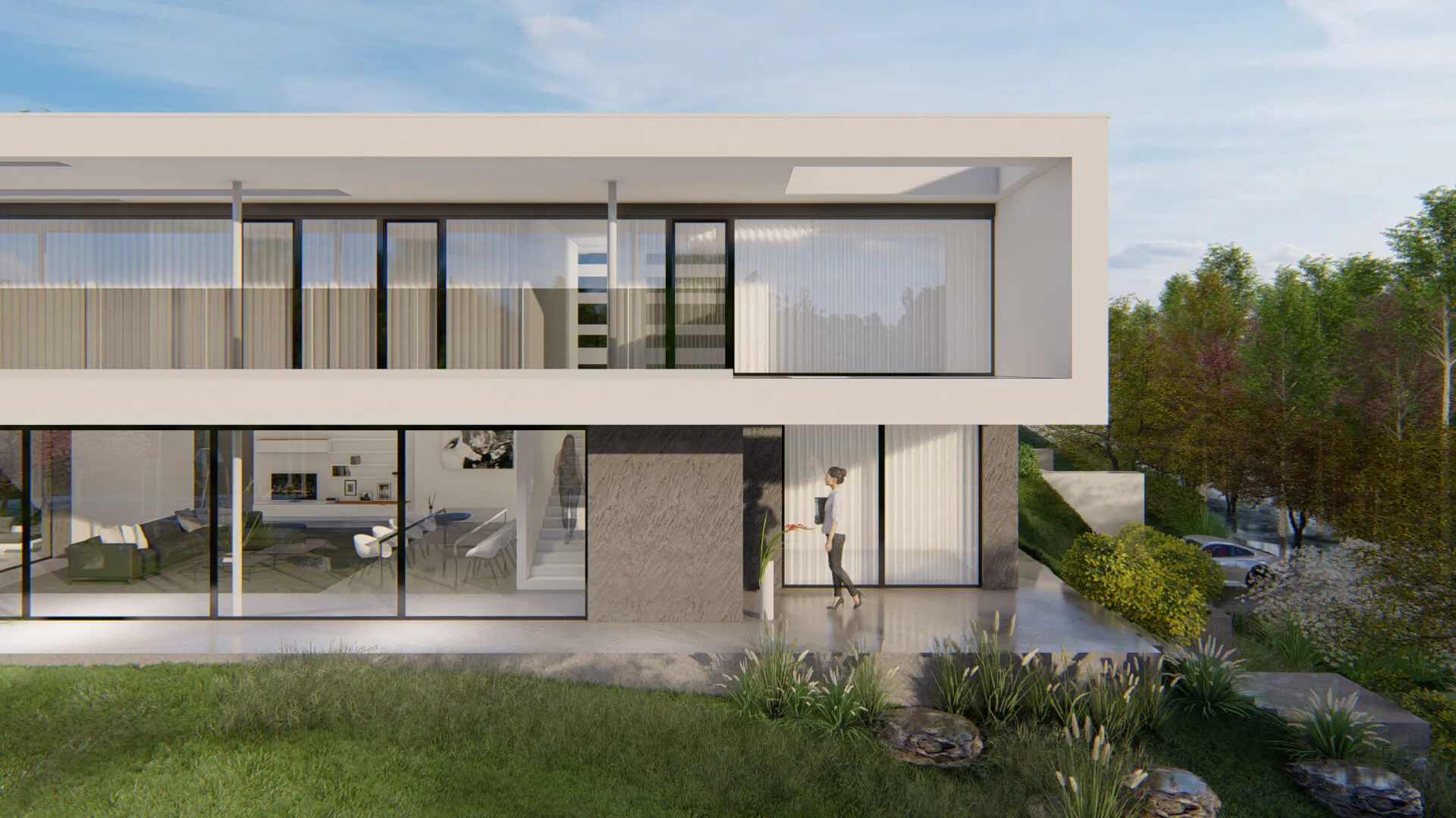 Későmodern stílusjegyeket mai elemekkel ötvöző ház ez, melynek bravúros megoldása a teljes homlokzatot felnyitó üvegfelület.