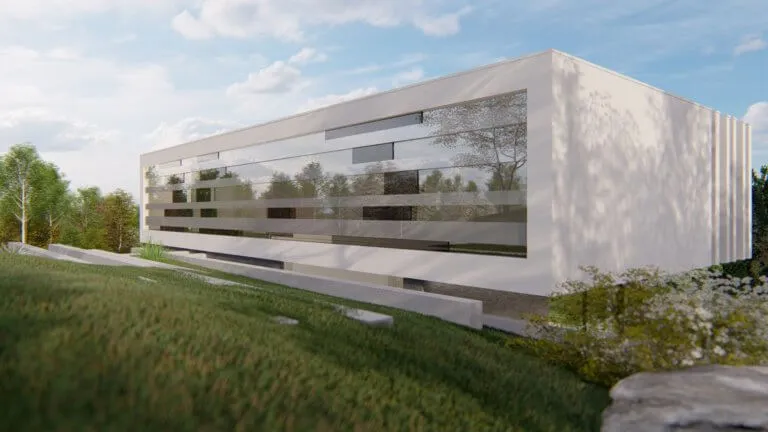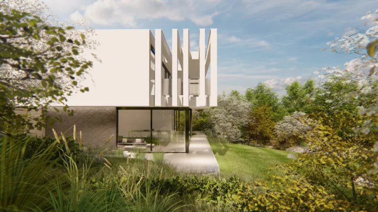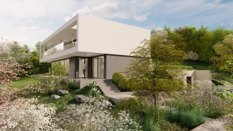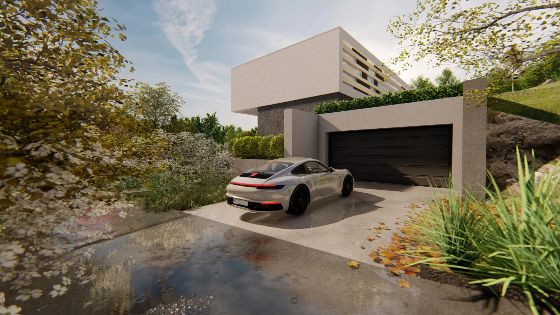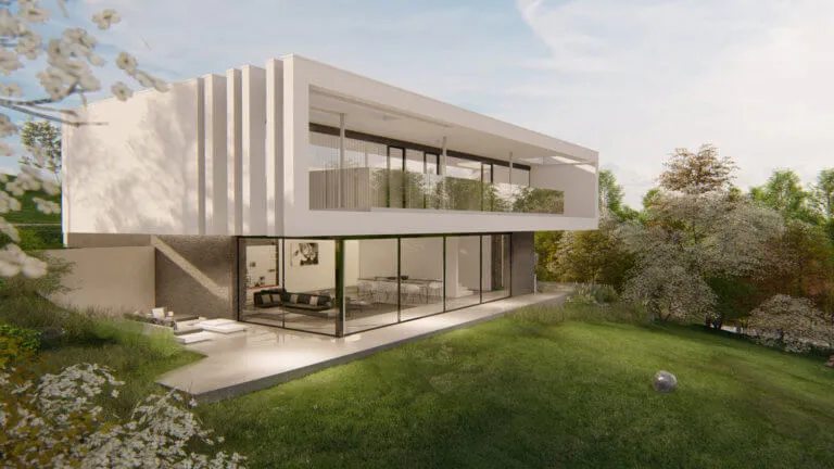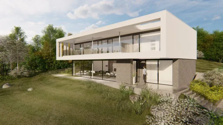 Későmodern stílusjegyeket mai elemekkel ötvöző ház ez, melynek bravúros megoldása a teljes homlokzatot felnyitó üvegfelület.