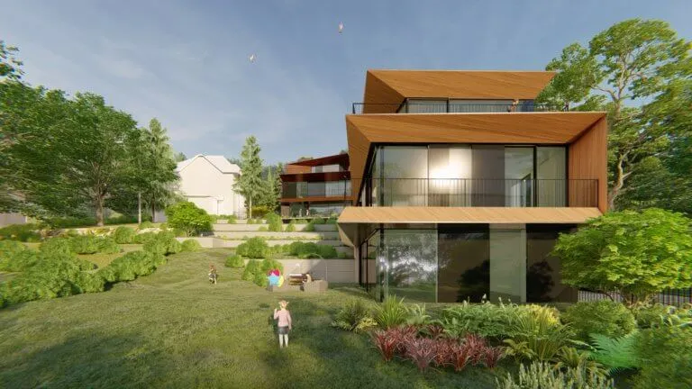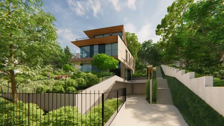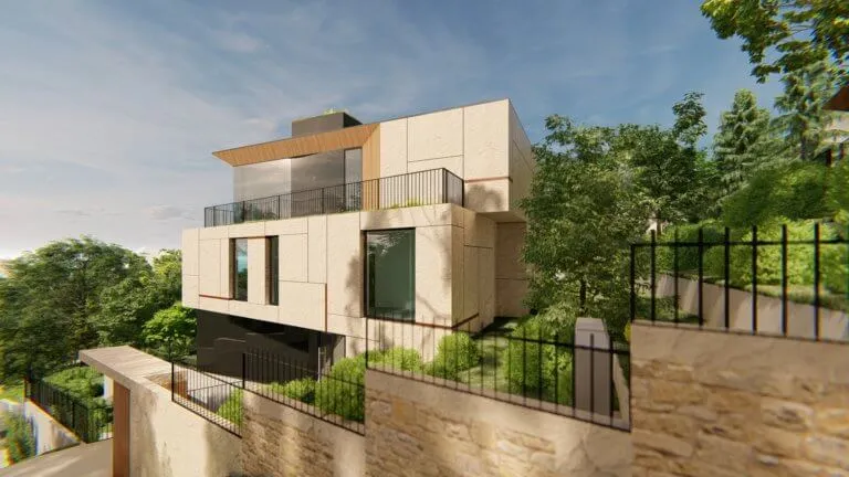 A meredek telekre helyezett családi házak kapcsolatát az éles szögben metszett párkányzatok és a változatos burkolatok adják.