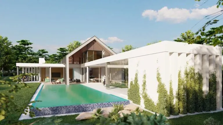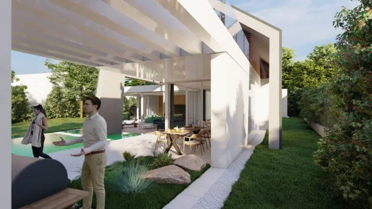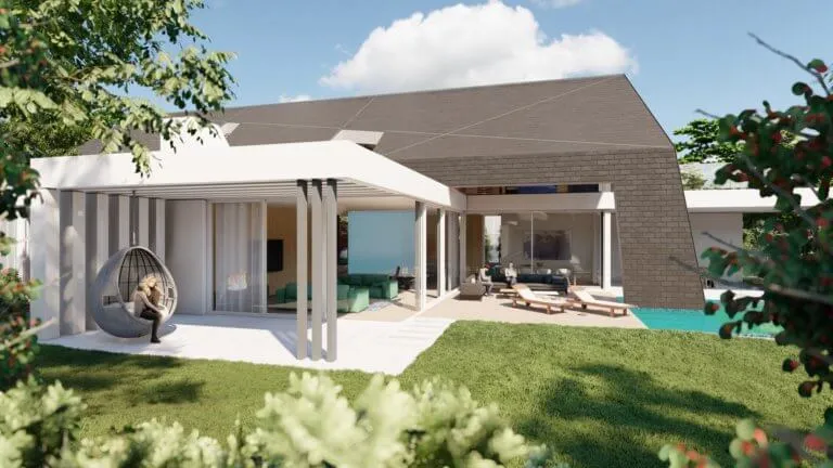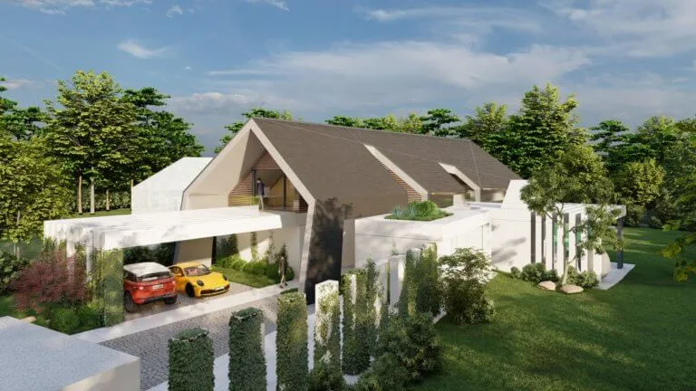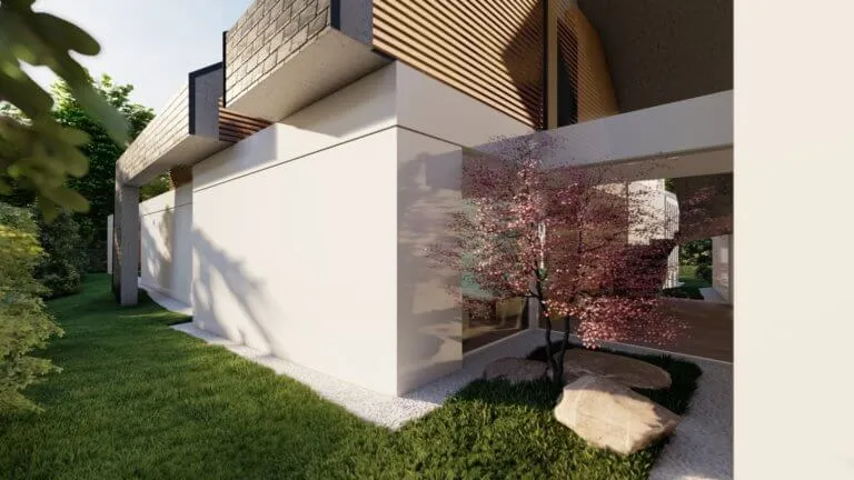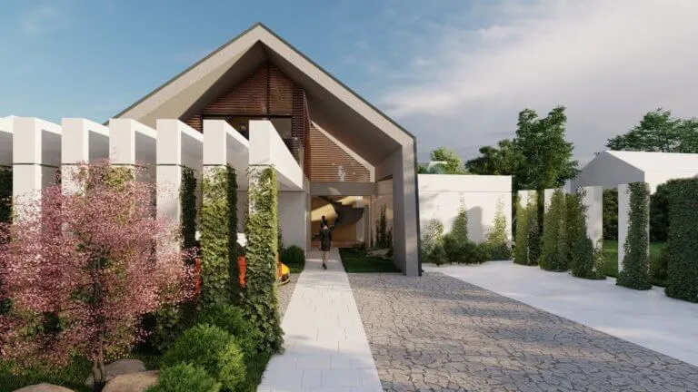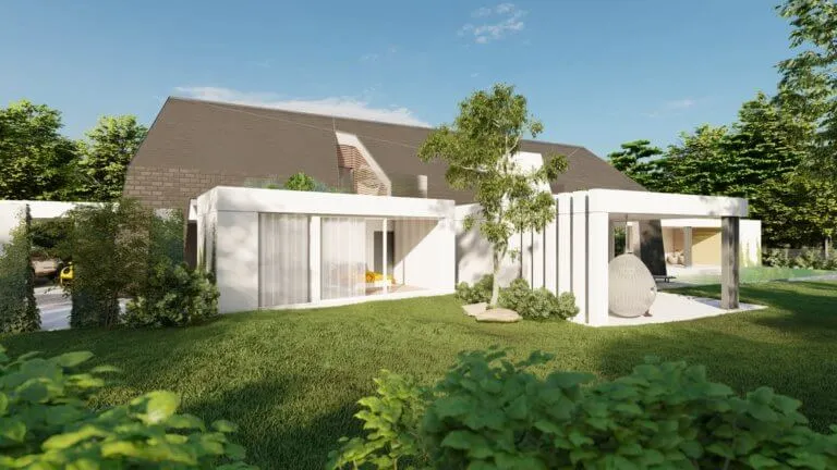 Környezetéhez való minél jobb illeszkedést célozza a népi építészet alapelemeit felbontó és újraalkotó családi ház.