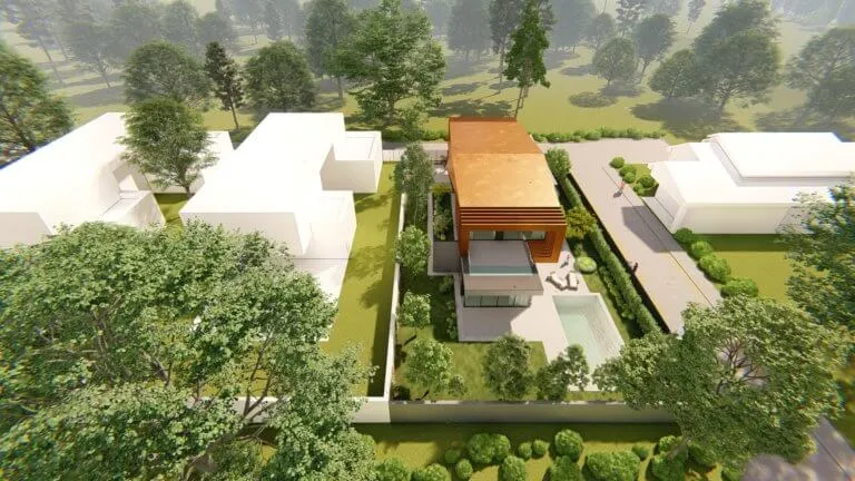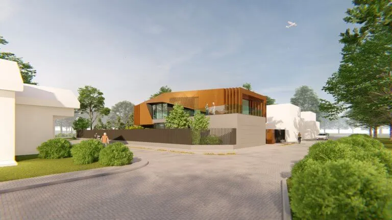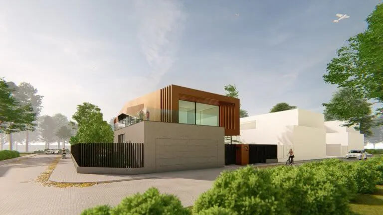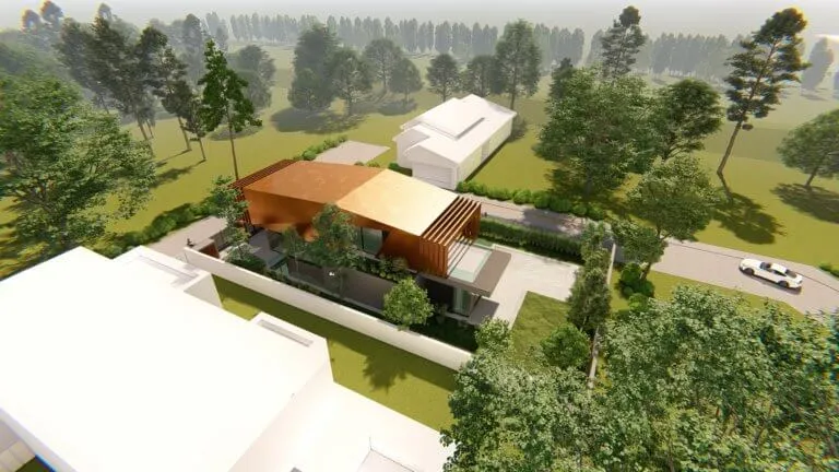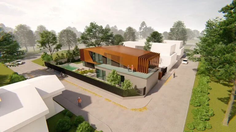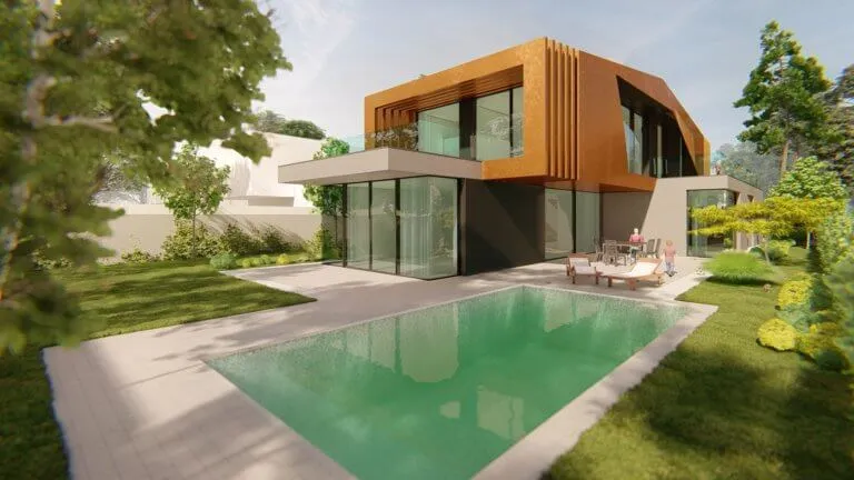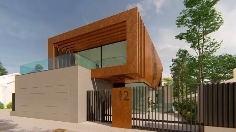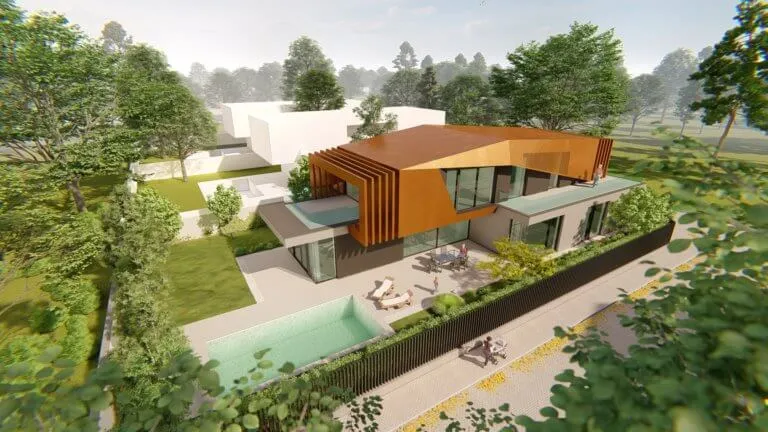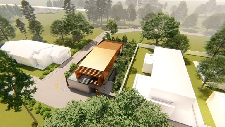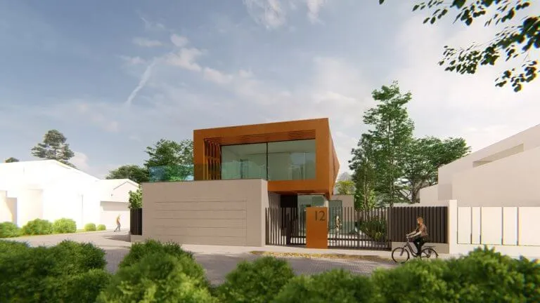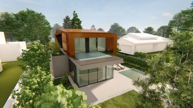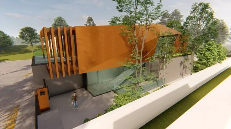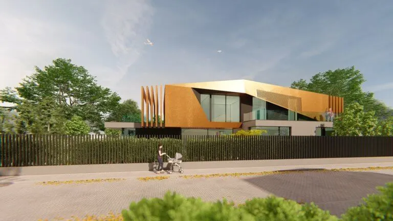 A síkok által határolt, központi épületrész csillogó burkolata és ebből metszett árnyékolói e bátor családi ház kulcselemei.