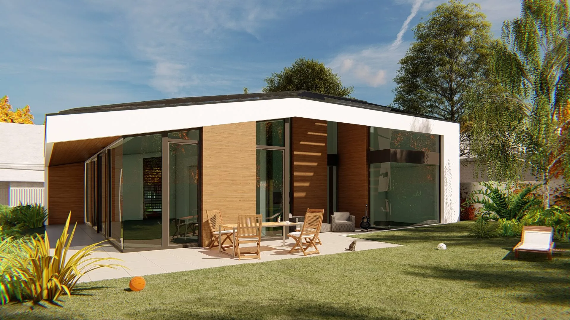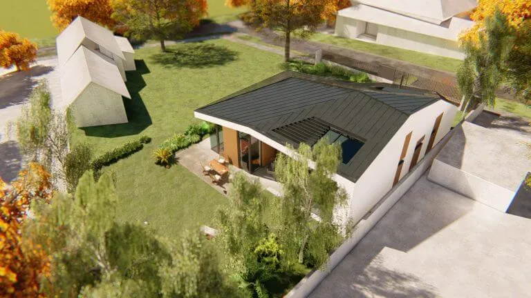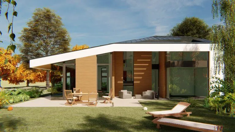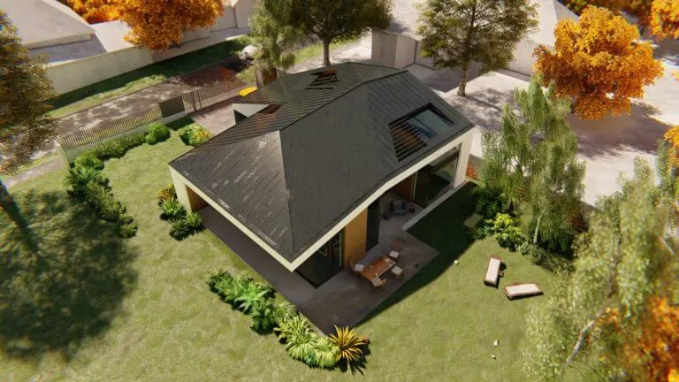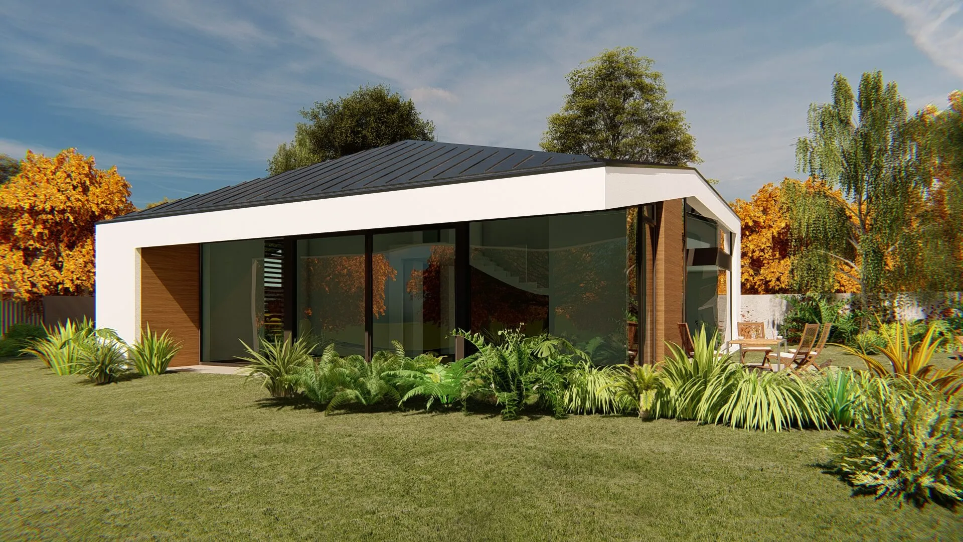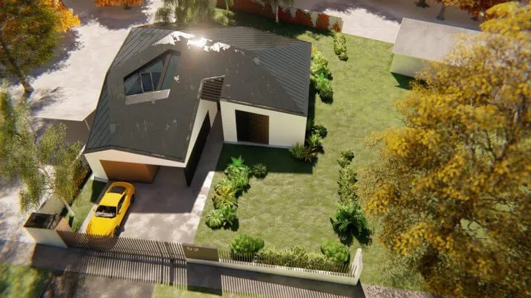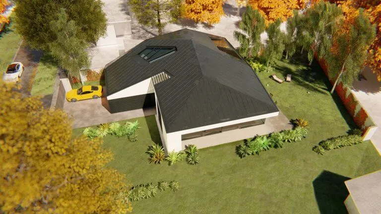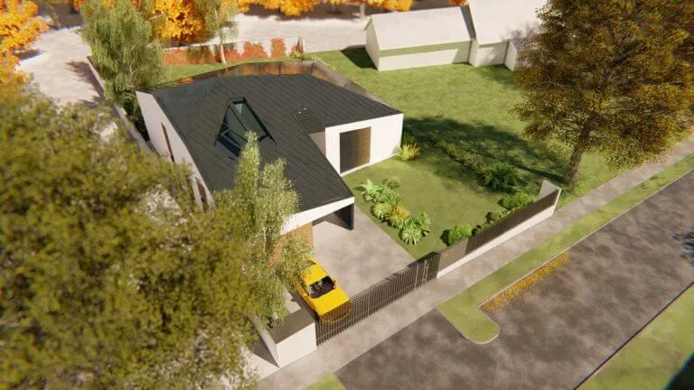 Bátor építészeti gesztusként a sokszögben tört tető és az azt lekövető homlokzatok a ház környezetét engedik érvényre jutni.