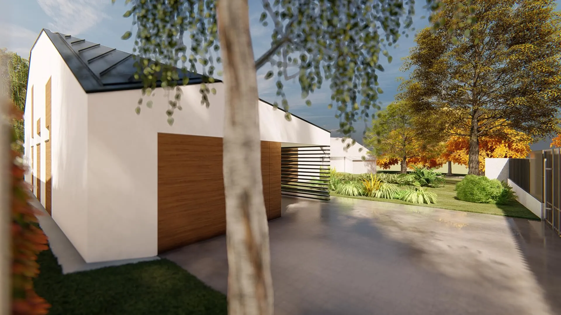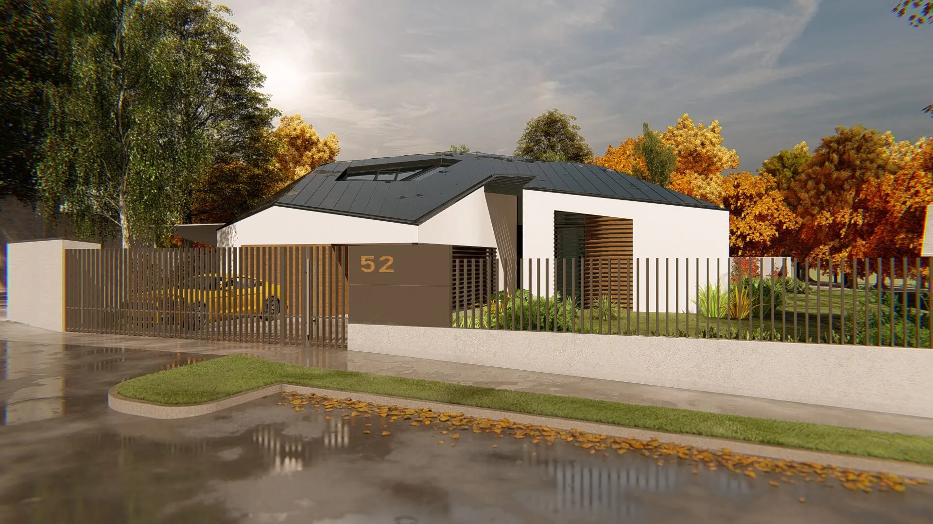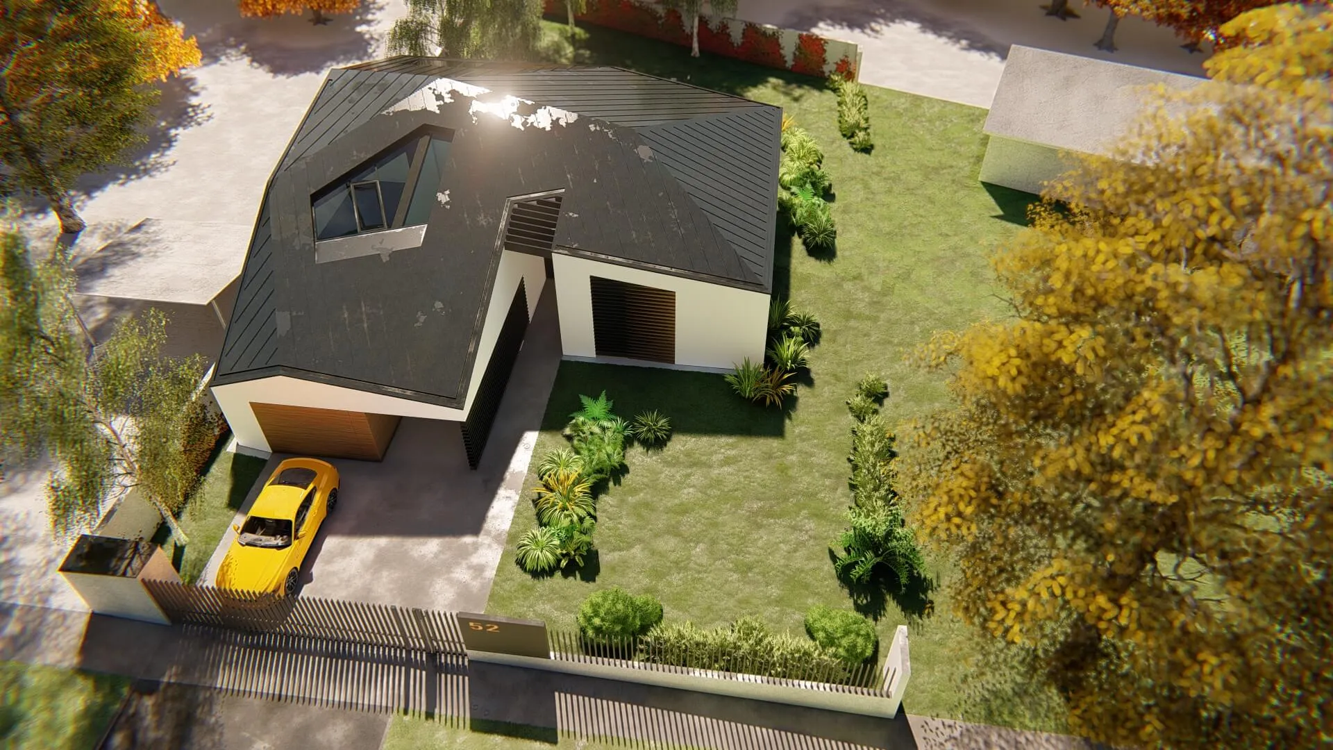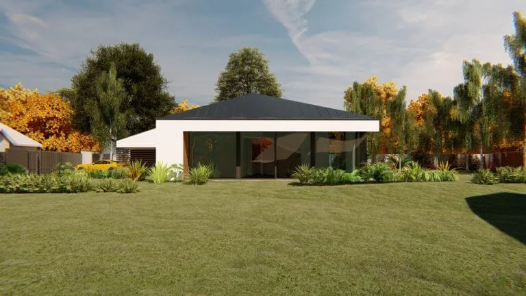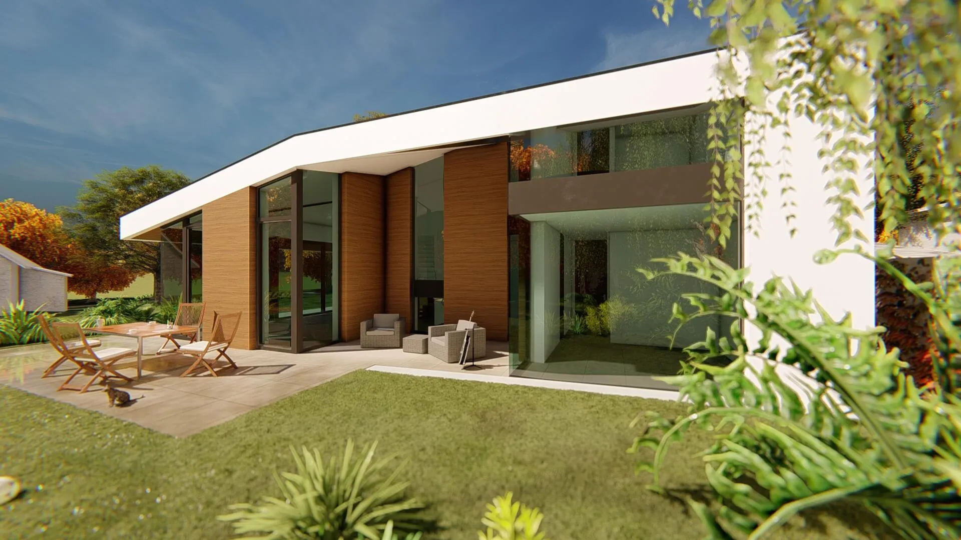 Bátor építészeti gesztusként a sokszögben tört tető és az azt lekövető homlokzatok a ház környezetét engedik érvényre jutni.