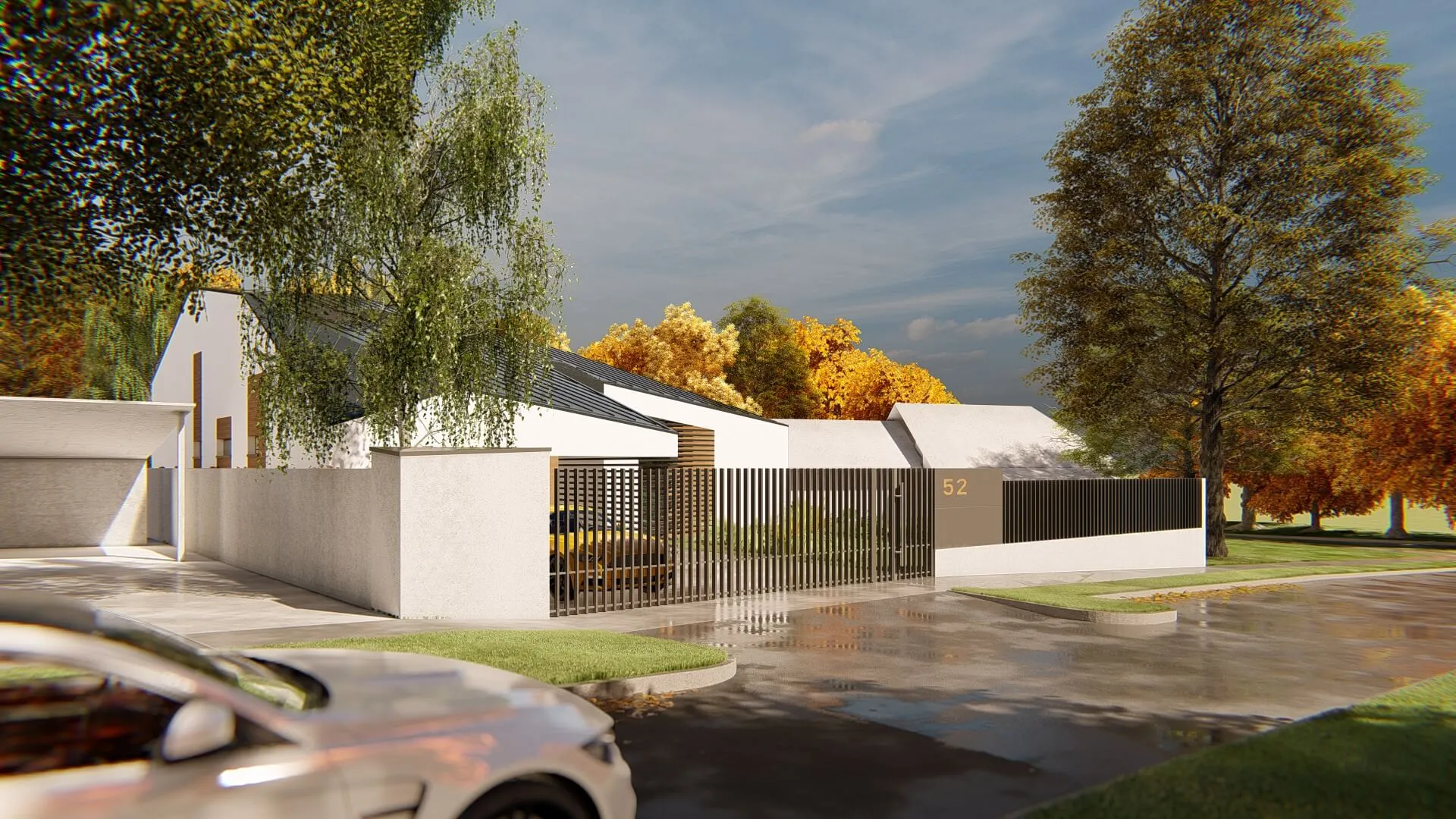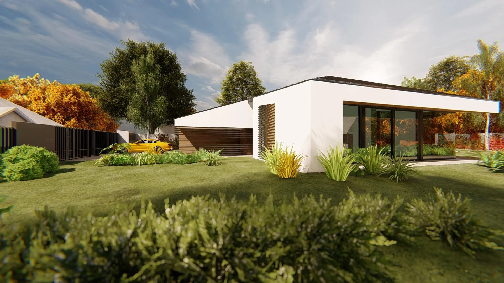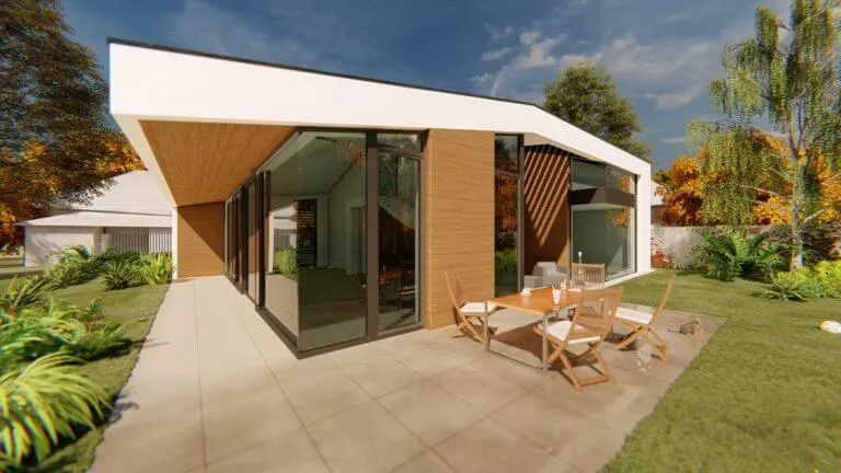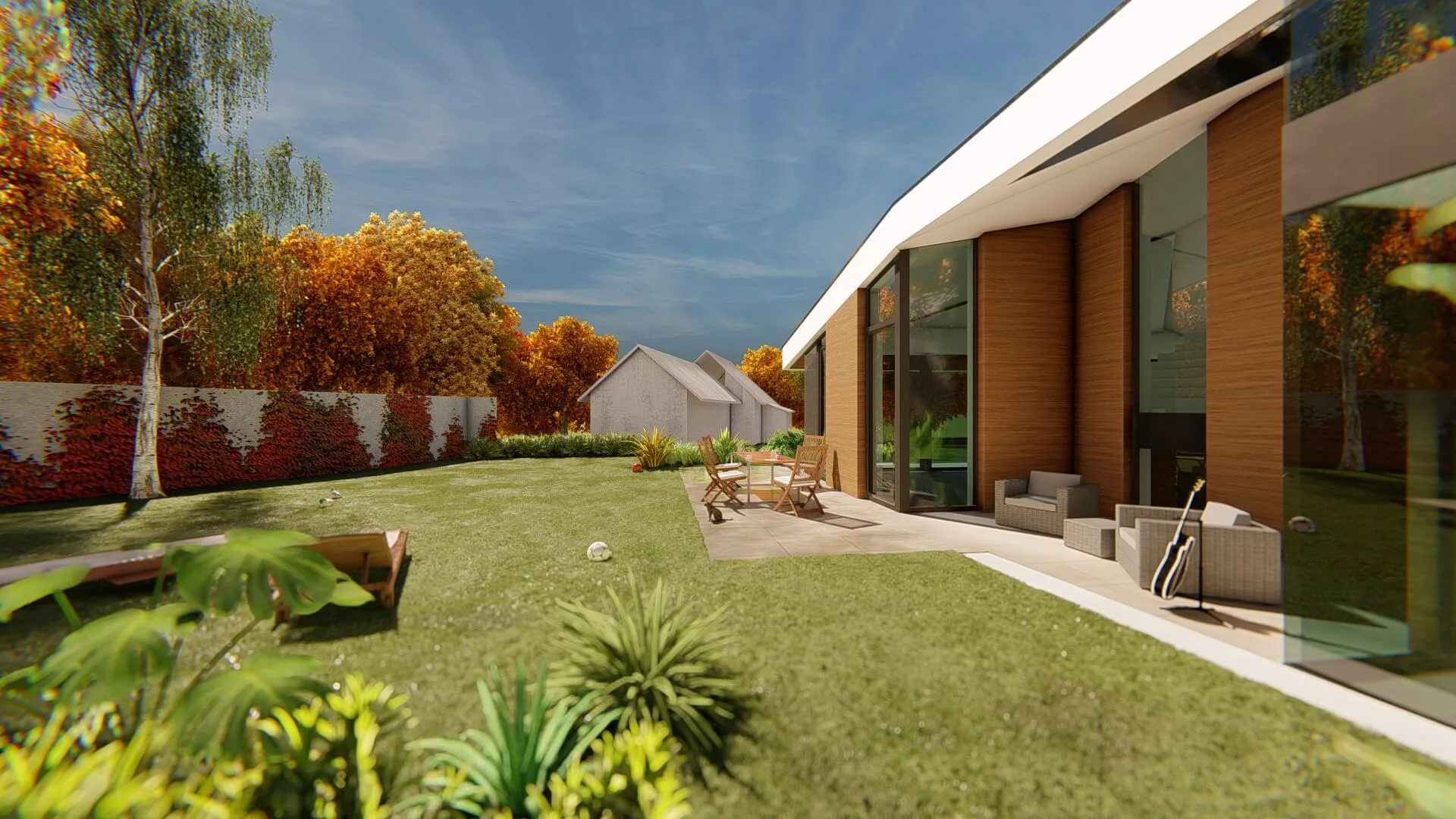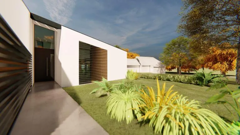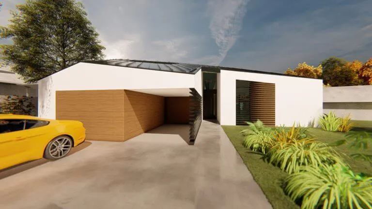 Bátor építészeti gesztusként a sokszögben tört tető és az azt lekövető homlokzatok a ház környezetét engedik érvényre jutni.