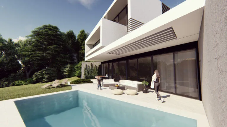 Környezetére klasszikus arányú, zárt utcai homlokzattal reagáló családi ház szinte posztmodern voluta-átiratot is hord.