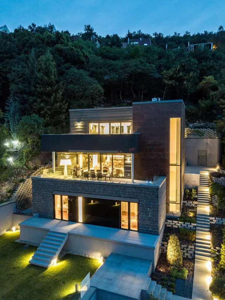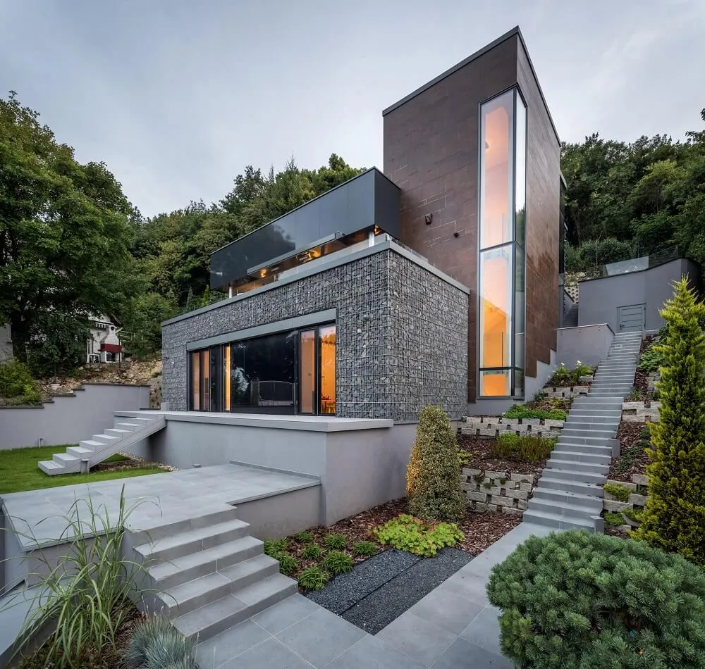 Különböző színek és anyagok teszik változatossá e feltűnő villát (régi épület átalakítása).
