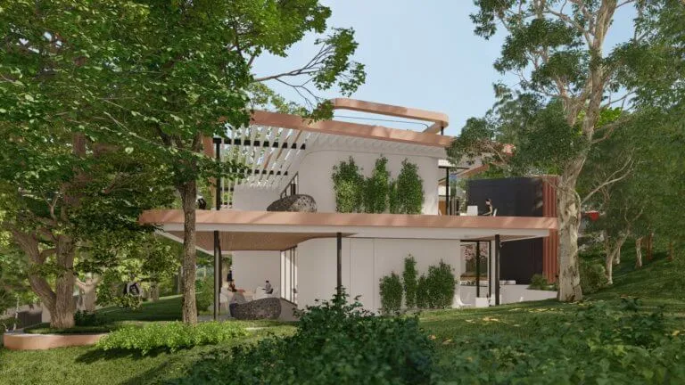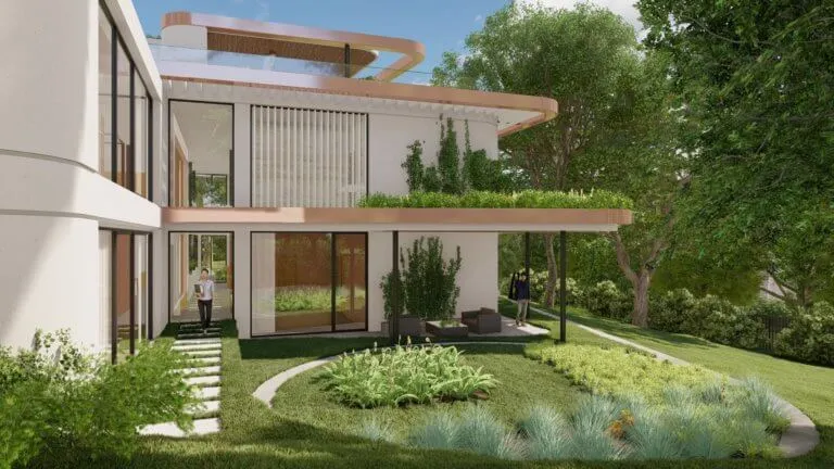 A fák mögé rejtett villa bár formáival a ’30-as évek modernizmusát idézi, játékos szinteltolásai frissességét sugározzák.